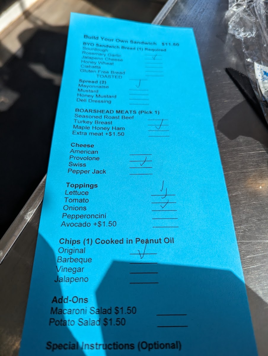 Choose your bread including sourdough rosemary garlic bread, ciabatta and more. Select from several Boar's head meats, cheeses, toppings, and dressings. Served with a dill pickle